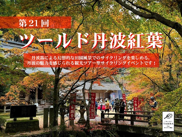 丹波の四季の魅力をサイクリングを通じてご紹介するツールド丹波・・・秋は、美しい紅葉と寺院を愛でることで心身ともに癒され、丹波霧による幻想的な田園風景でのサイクリングを楽しめ、スポーツサイクル初心者~中級者の方や女性も大歓迎!丹波の魅力を感じられる観光ツアー型サイクリングイベントです!